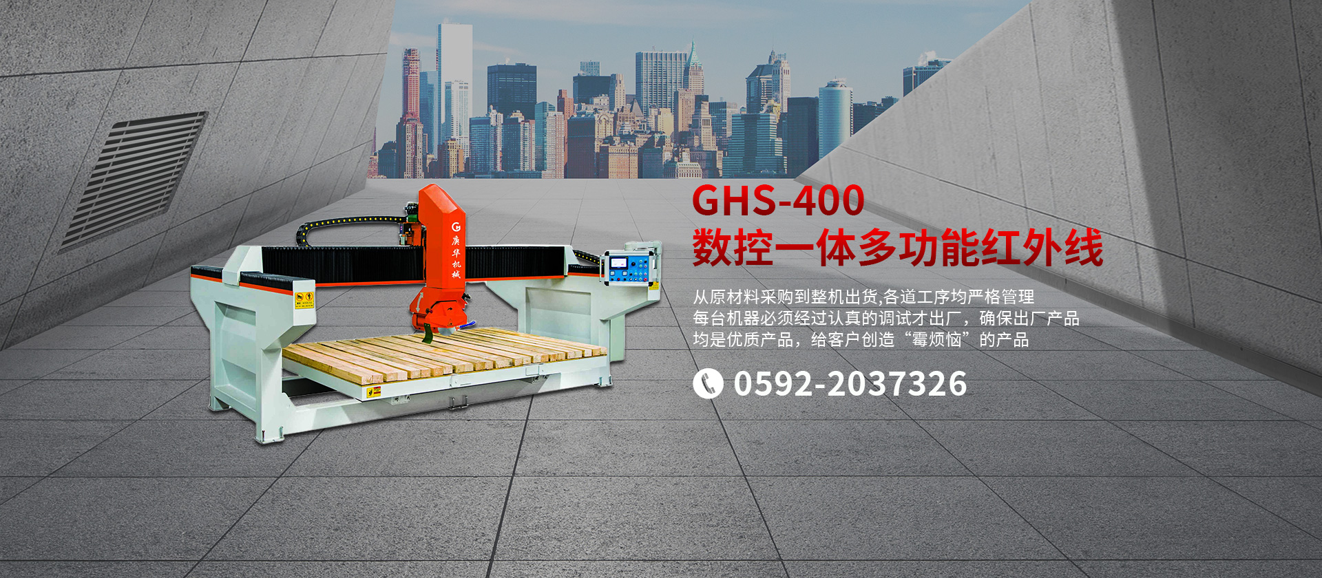 公司生產適用于大理石、花崗巖、砂巖、石灰巖、洞石、玉石等各種石材的機械設備。主要產品有GHHW系列紅外線橋式切邊機、GHQQ系列橋式多片組合鋸石機、各種手動/自動/單頭/多頭板材磨拋機、以及各種異形加工設備。公司長期注重品質管理,以質量為中心,從原材料采購到整機出貨,各道工序均嚴格管理,每臺機器必須經過認真的調試才出廠,確保出廠產品均是優質產品,給客戶創造“零煩惱”的產品。